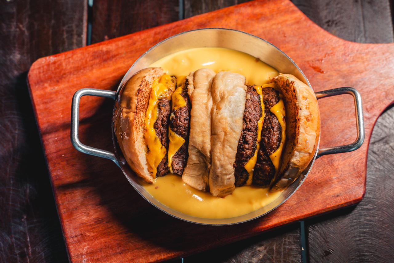 Pão de Hambúrguer, 02 Bland de carne artesanal de 120g, 02 Queijo Cheddar e Piscininha de creme Cheddar.