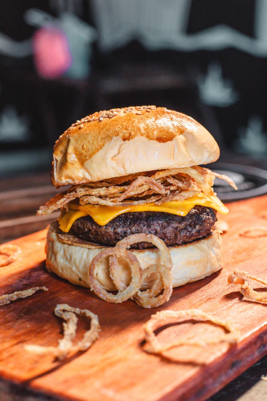 Pão de Hambúrguer, Bland de carne artesanal de 120g, Queijo cheddar e Cebola crispy.