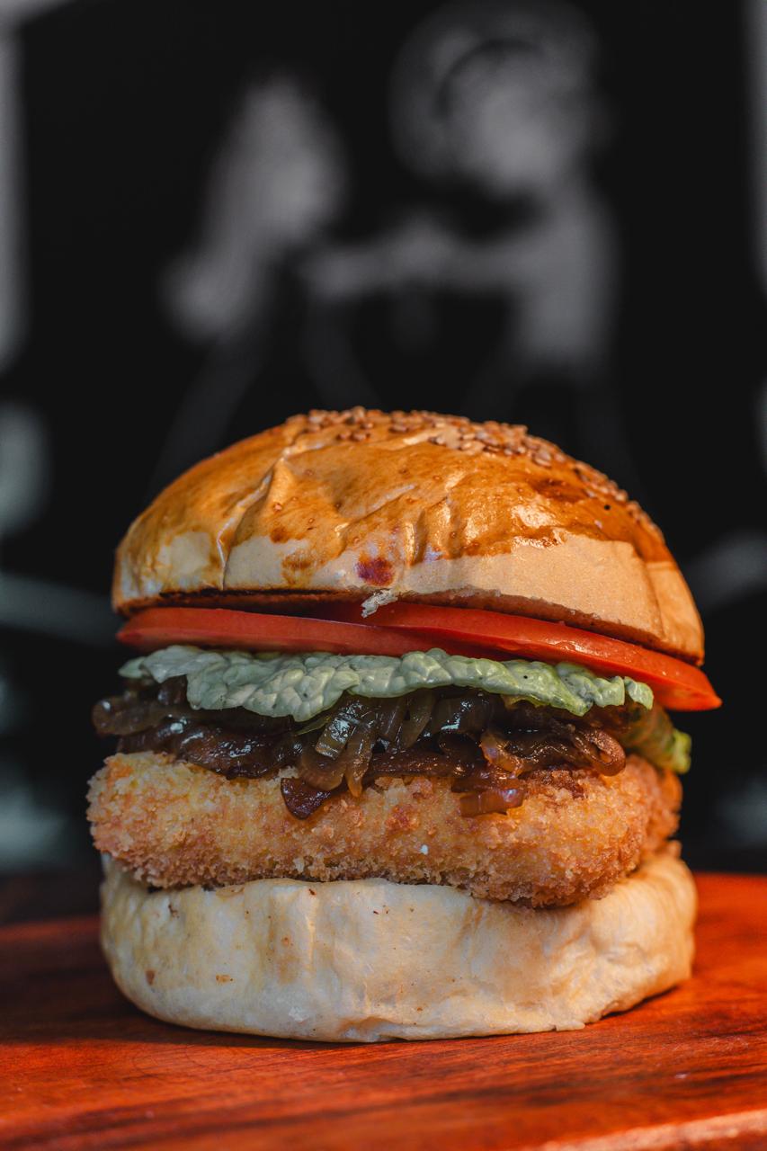 Pão de Hambúrguer, Queijo Regional empanado, Cebola Caramelizada, Alface americana e Tomate.