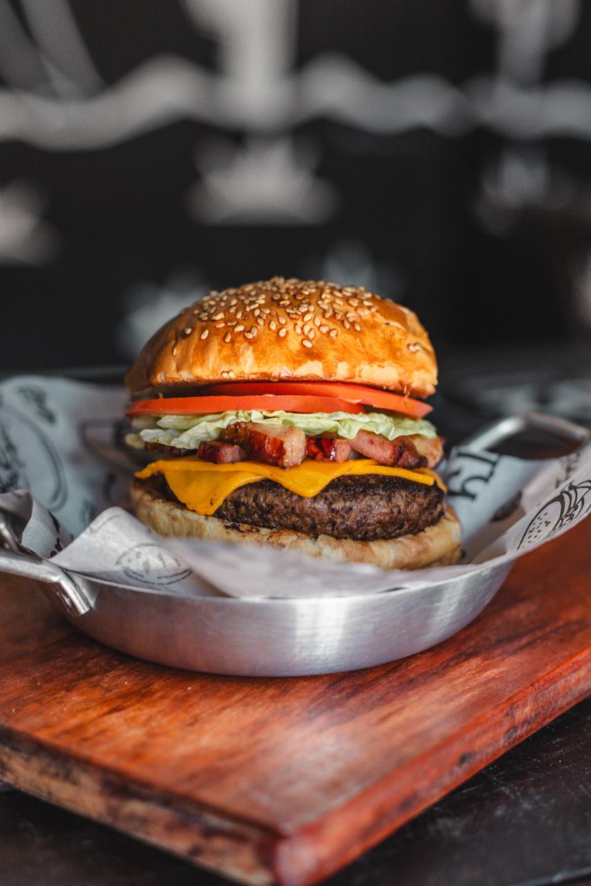 Pão de Hambúrguer, Bland de carne artesanal de 120g, Queijo cheddar, Bacon, Molho Barbecue, Alface americana e Tomate.