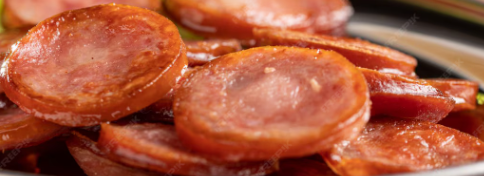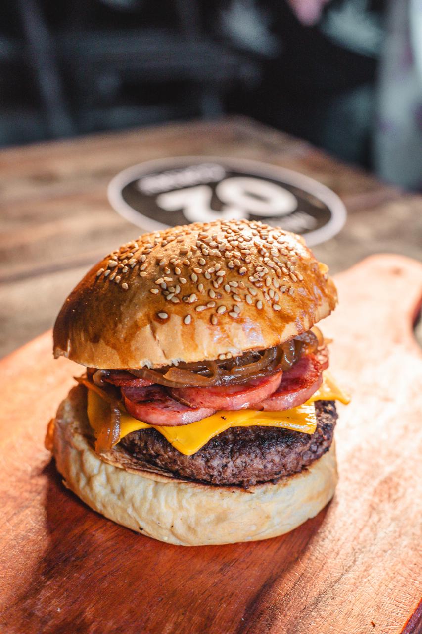 Pão de Hambúrguer, Bland de carne artesanal de 120g, Queijo cheddar, Calabresa e Cebola Caramelizada.