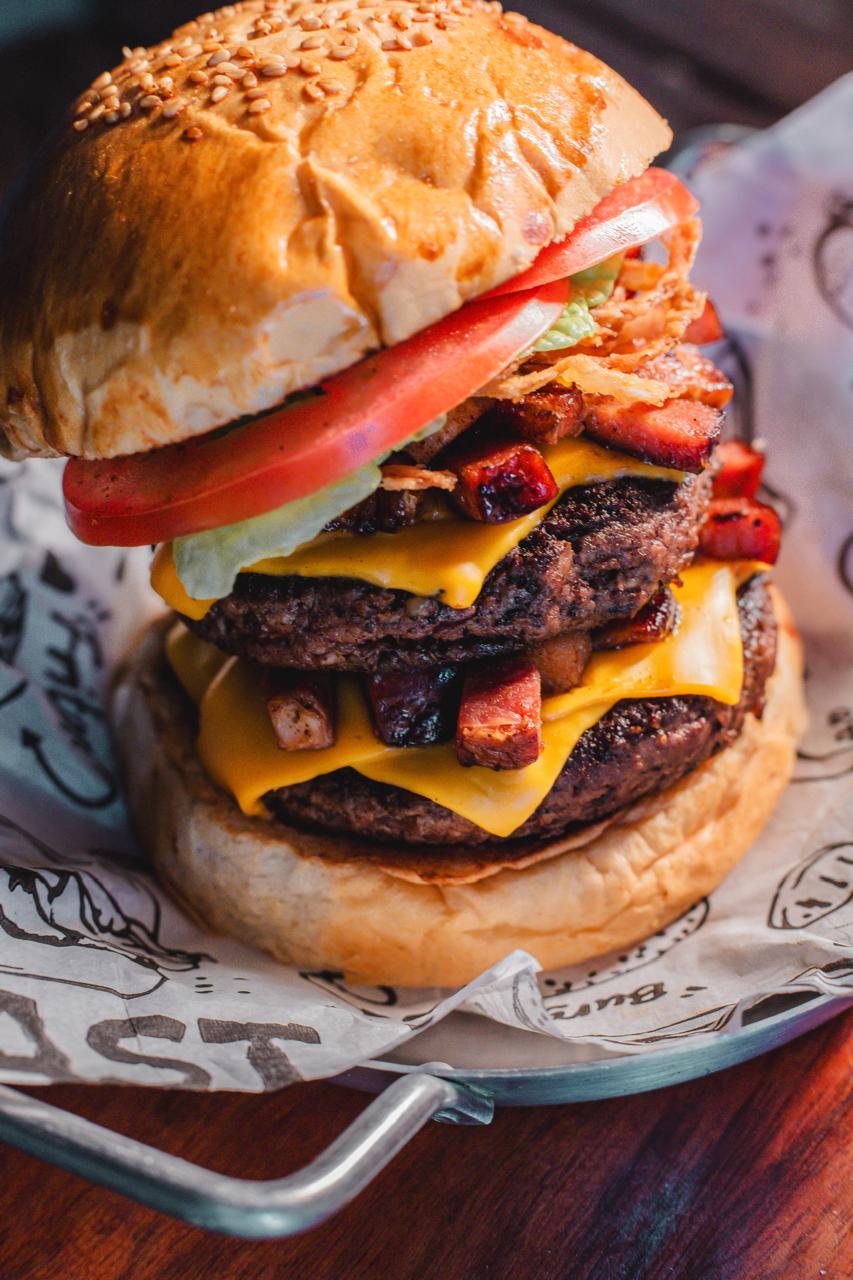 Pão de Hambúrguer, 02 Bland de carne artesanal de 120g, 02 Queijo cheddar, 02 Bacon, Alface Americano, Tomate e Cebola Crispy.