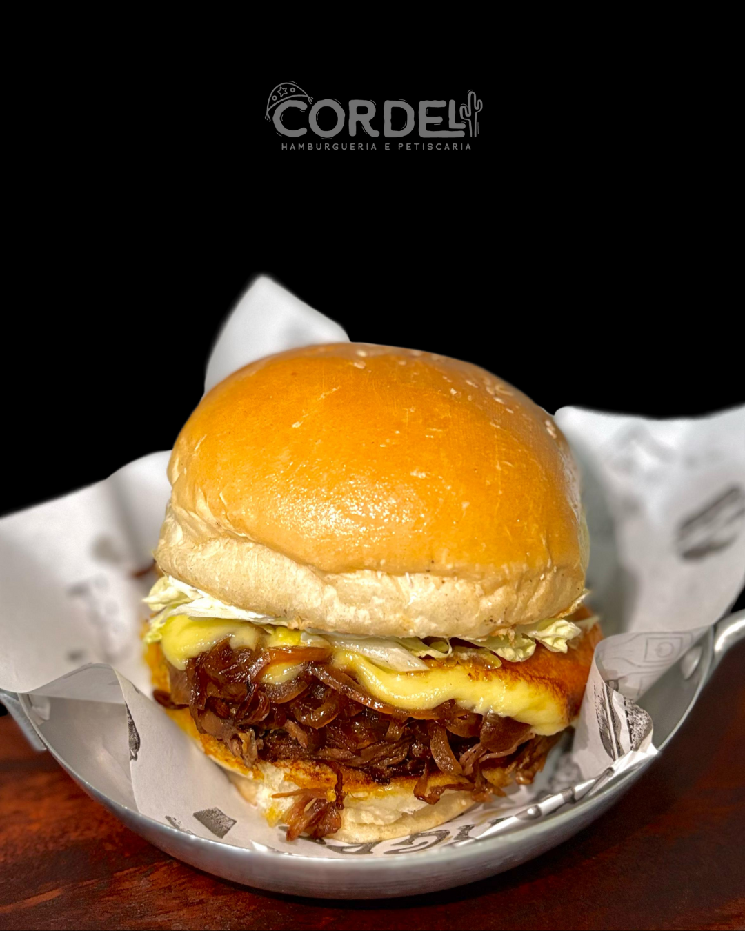 Pão de hambúrguer, carne fraldinha feita na panela de pressão e desfiada 80g, queijo regional selado na chapa, cream cheese, cebola caramelizada e alface americano.