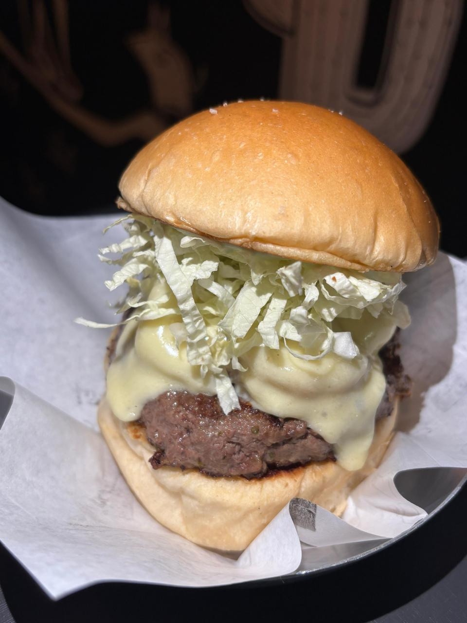 Pão de Hambúrguer, Bland de carne artesanal de 120g, Camarão 80g, Creme de queijo muçarela e Alface Americano.